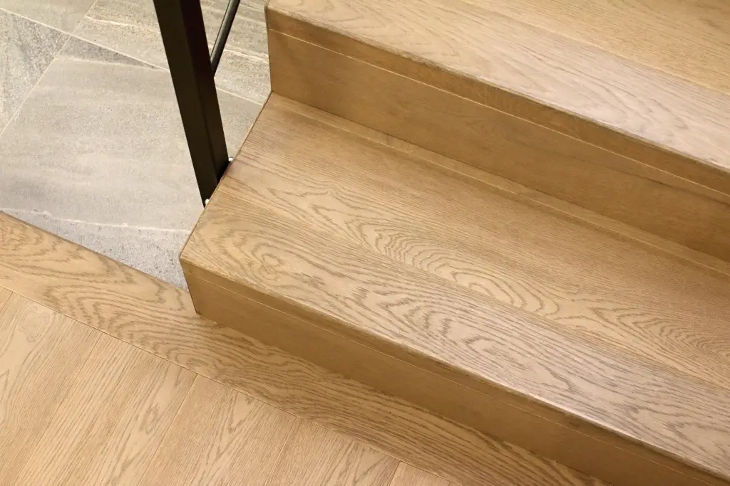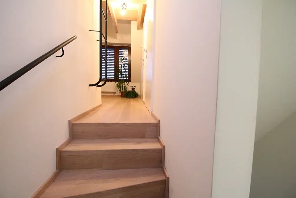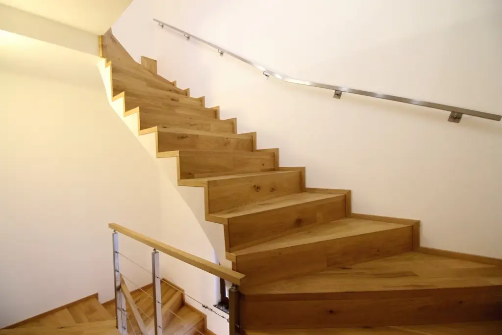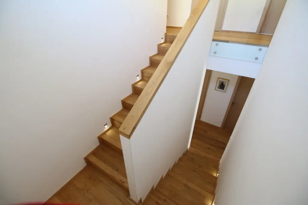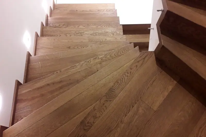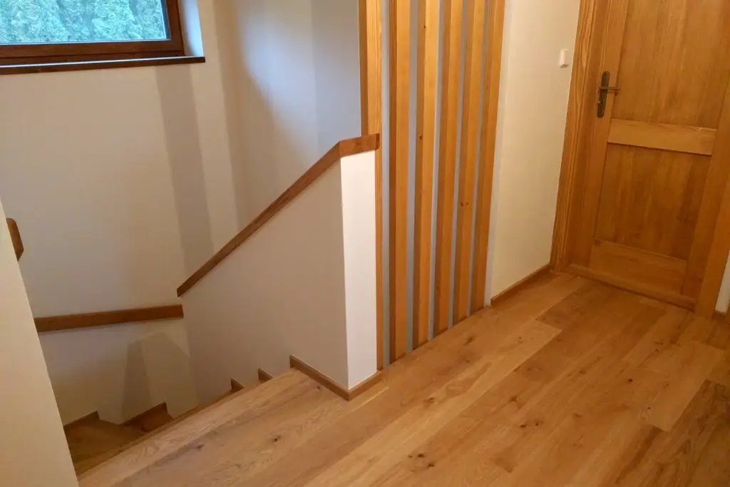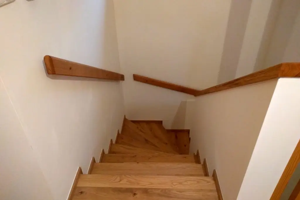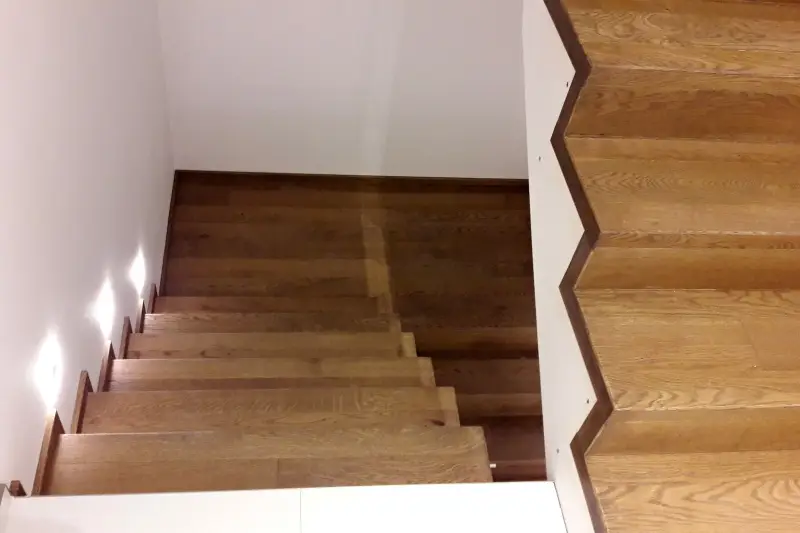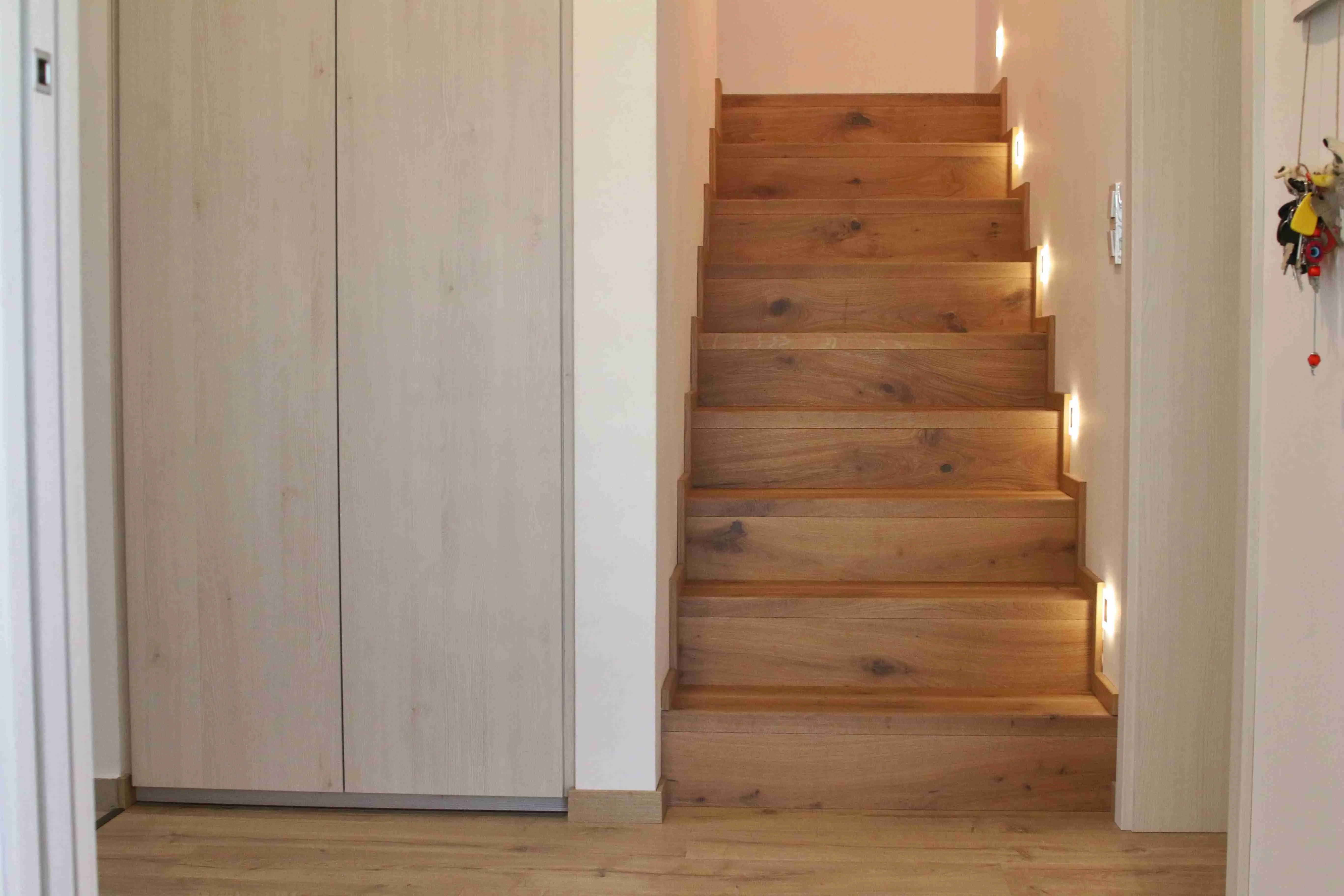 Co se týče výchozího typu obkladu, kterou při výrobě používáme, tak nejčastěji se jedná o vícevrstvé obklady používané také jako podlahová krytina do dalších prostor domu. Všechny výchozí dřevěné krytiny jsou vyvzorovány v našem pražském showroomu. Zde je k vidění i konkrétní zpracování dřevěného schodiště.
